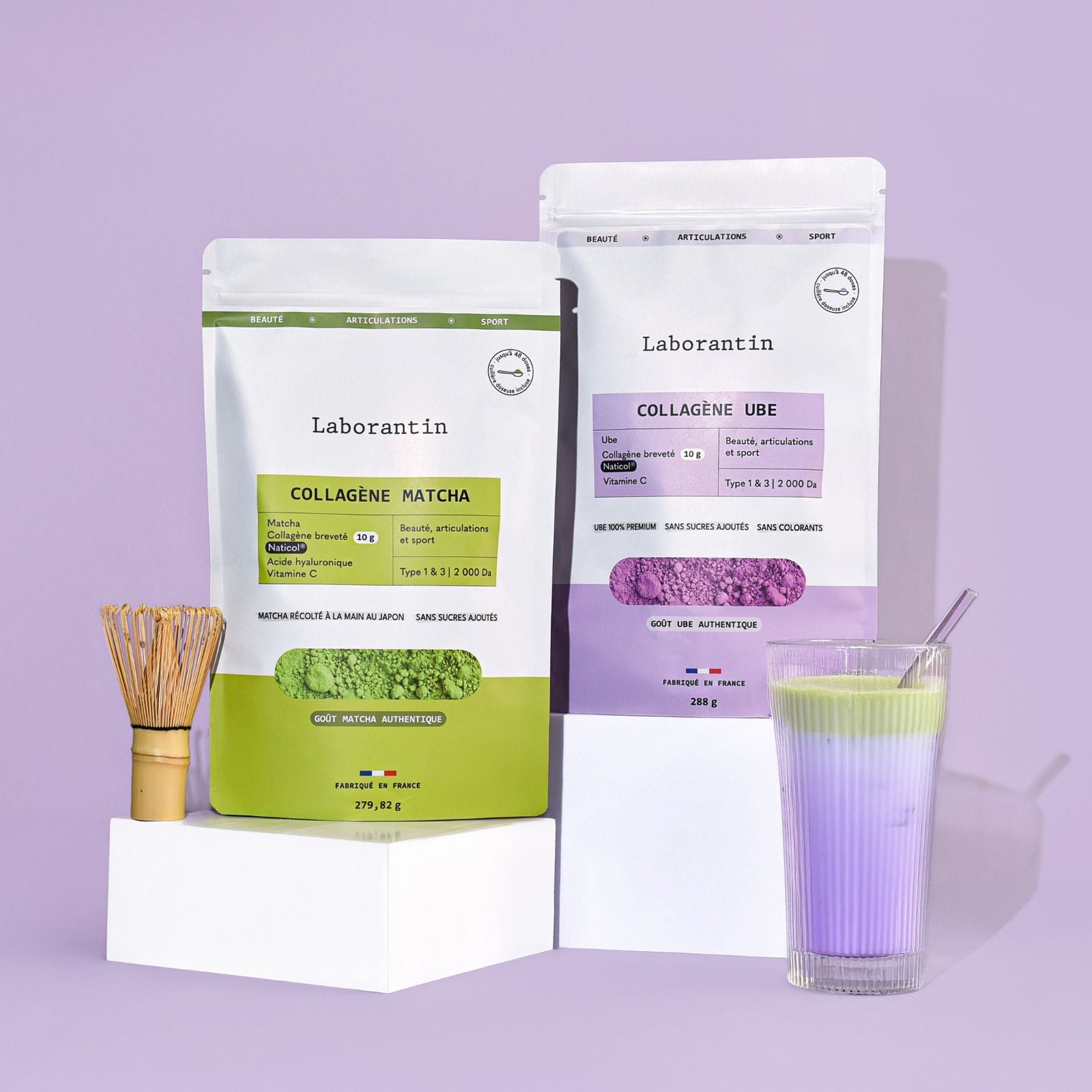 - Ube : Collagène + vitamine C + ube (igname violet riche en antioxydants) → pour sublimer la peau, renforcer les défenses naturelles et améliorer la digestion.