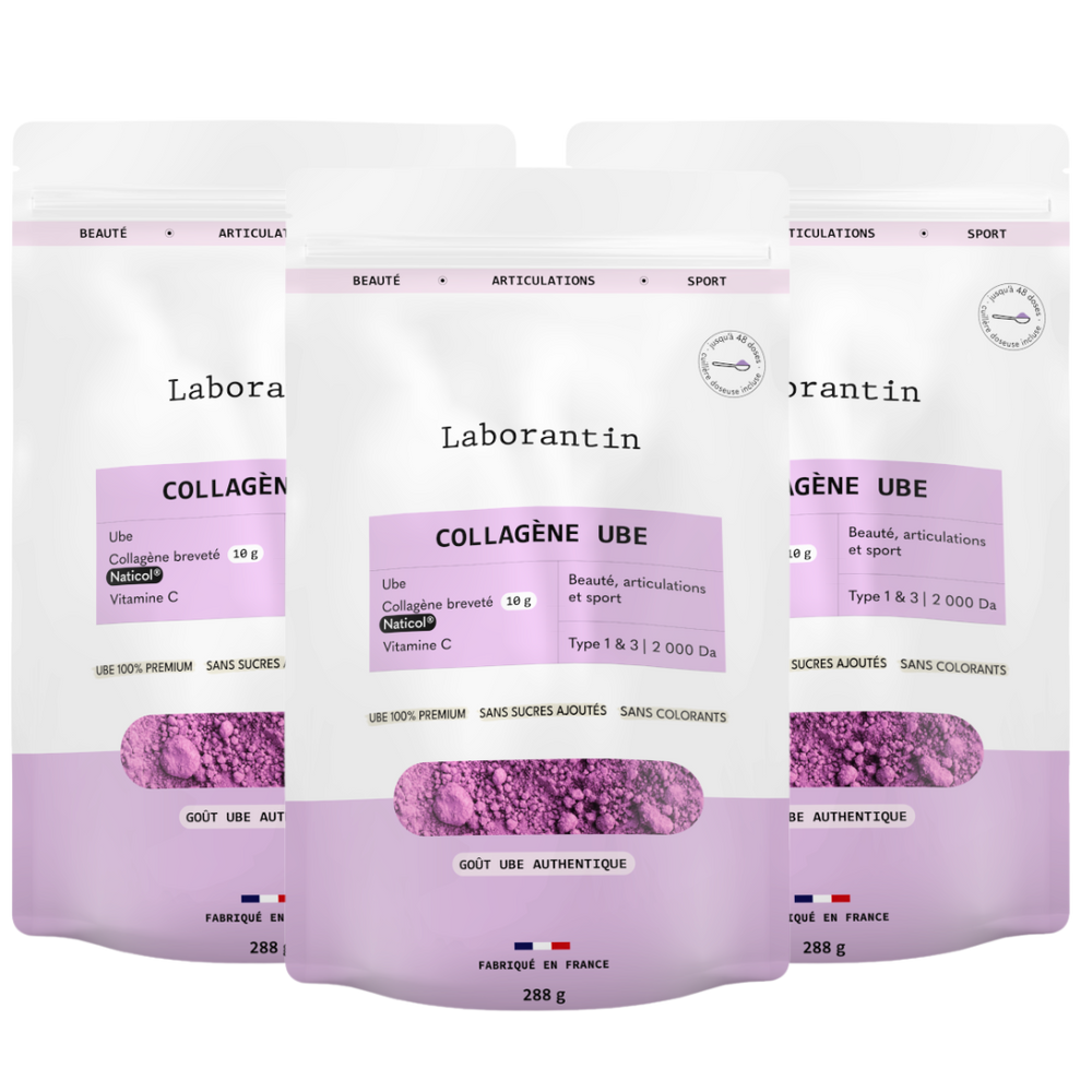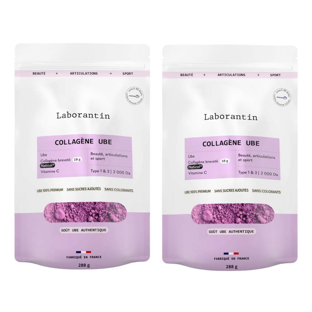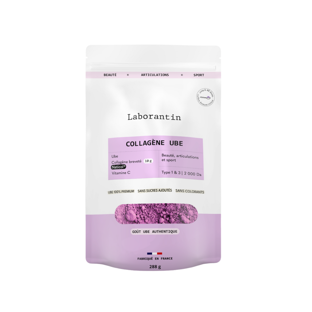 Notre Collagène Ube en poudre associe les peptides de collagène marin brevetés Naticol®, la vitamine C et l’ube, super-aliment naturellement violet riche en antioxydants, pour une formule aussi gourmande qu’efficace. Sans sucres ajoutés et délicatement vanillée, elle illumine le teint, préserve la fermeté de la peau, ralentit les signes du vieillissement, tout en favorisant une digestion harmonieuse et des défenses naturelles renforcées.