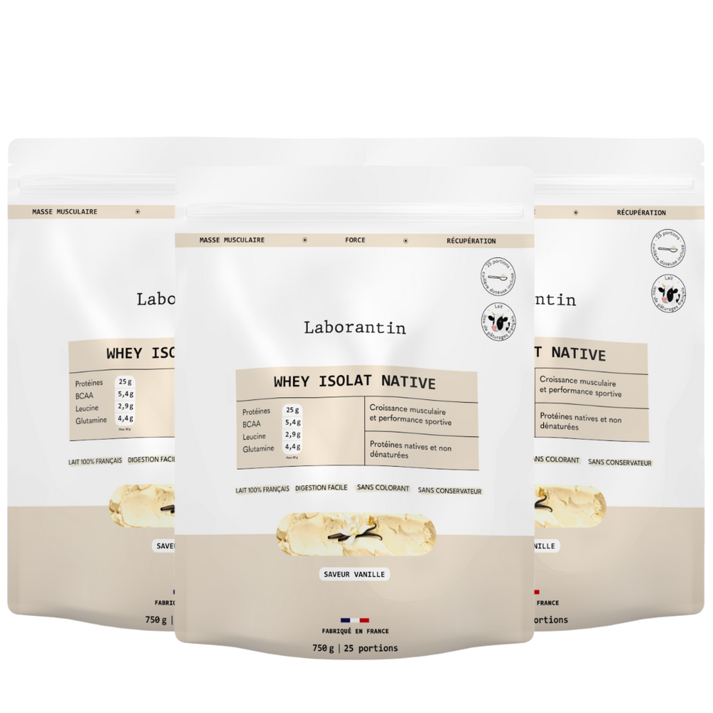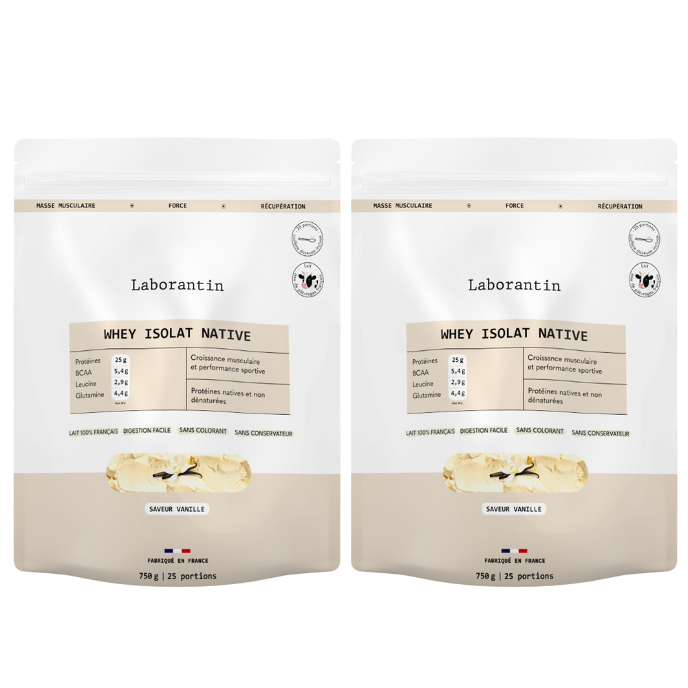 Issue de lait français et dosée à 98% de protéines, notre Whey Isolat Native allie pureté maximale, performance sportive et goût vanille intense.